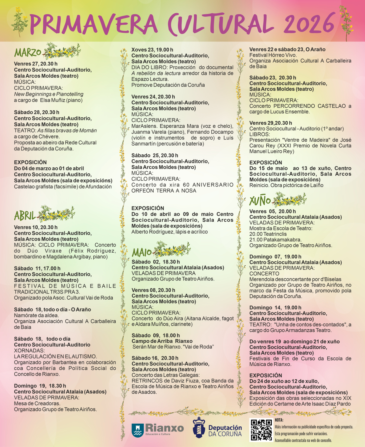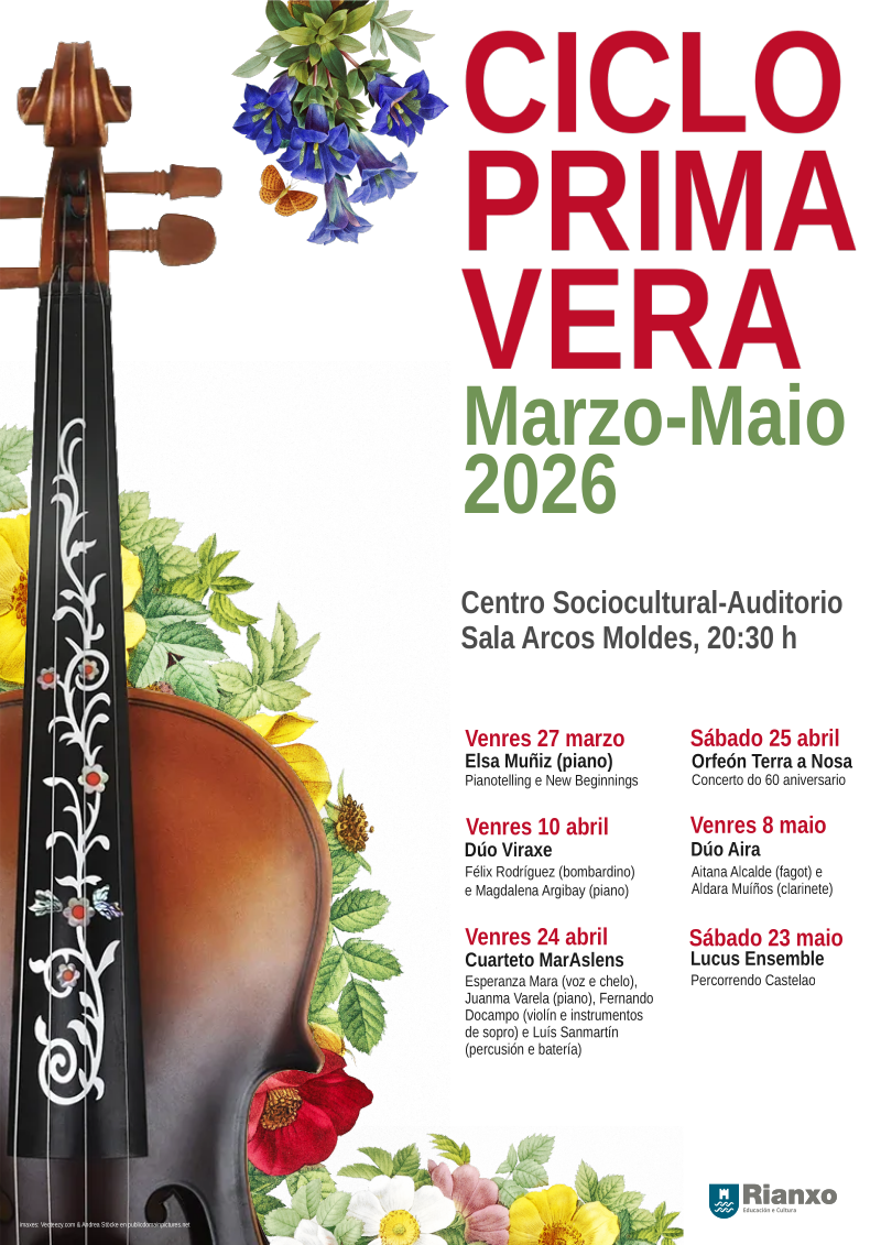 CICLO PRIMAVERA, concertos de música clásica. Os venres 27 de marzo, 10 e 24 de abril e 8 de maio e os sábados 24 de abril e 23 de maio. Ás 20:30, na sala Arcos Moldes do Centro Sociocultural-Auditorio de Rianxo. Venres 27 marzo Elsa Muñiz (piano). Pianotelling e New Beginnings Venres 10 abril Dúo Viraxe. Félix Rodríguez (bombardino) e Magdalena Argibay (piano) Venres 24...