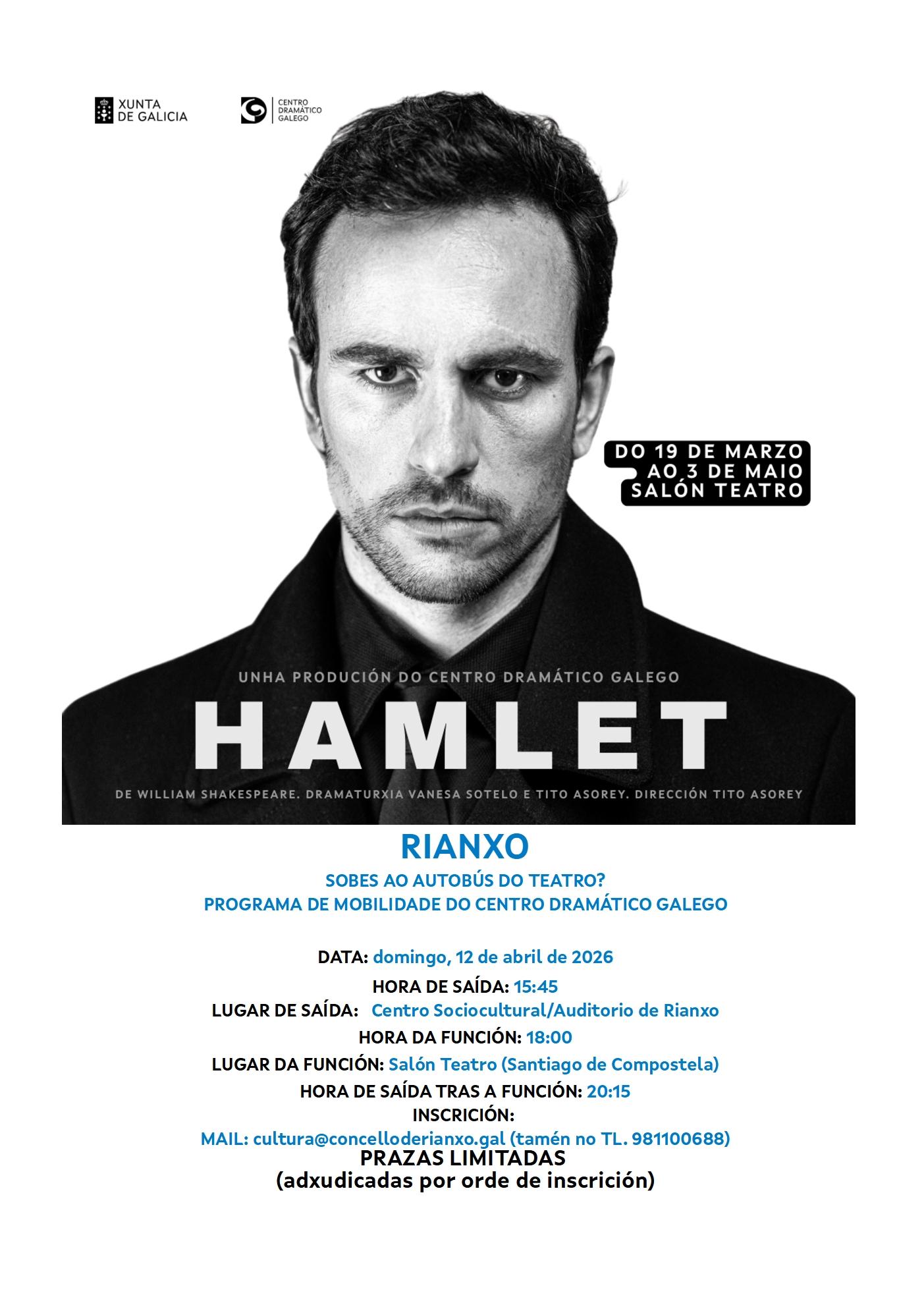 Teatro, Hamlet do Centro Dramático Galego dentro do programa Sobes ao autobús do Teatro? SOBES AO AUTOBÚS DO TEATRO? PROGRAMA DE MOBILIDADE DO CENTRO DRAMÁTICO GALEGO DATA: domingo 12 de abril de 2026 HORA DE SAÍDA : 15: 45 h (prégase puntualidade) LUGAR DE SAÍDA : Auditorio de Rianxo HORA DA FUNCIÓN: 18:00h LUGAR DA FUNCIÓN: Salón Teatro (Santiago de Compostela) HORA DE SAÍDA TRAS A FUNCIÓN: 20:15h ...