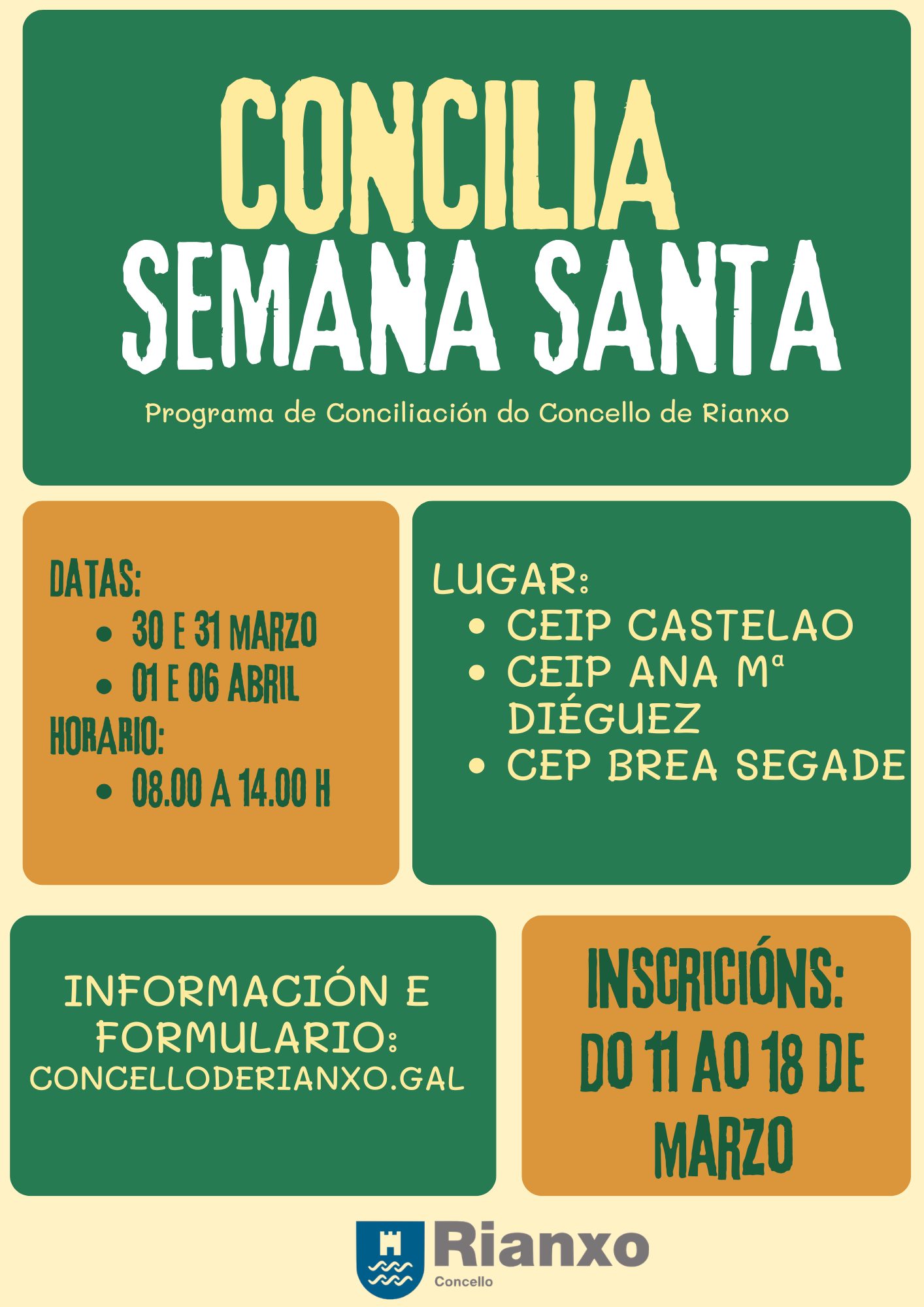Listaxes definitivas Publicase a listaxe de participantes do Concilia Semana Santa 2026. Listade definitiva 26/03/26 O servizo realizarase unicamente no CEIP Castelao. Aínda quedan prazas dispoñibles, polo que o prazo de inscrición continuará aberto ata completar as...