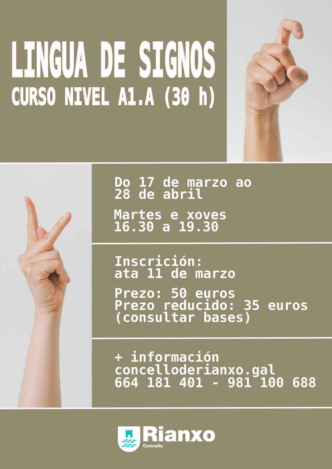 Rematado o prazo de inscrición, todas as persoas que se inscribiron obtiveron praza. Comunicaráselles por teléfono ou correo electrónico e facilitaráselles o recibo para o pagamento. Aínda quedan prazas dispoñibles. Se estás interesada/o, podes inscribirte; a listaxe seguirá a orde de inscrición. _____________________________________________________________________________________________________________________ CURSO: Lingua de Signos Española...