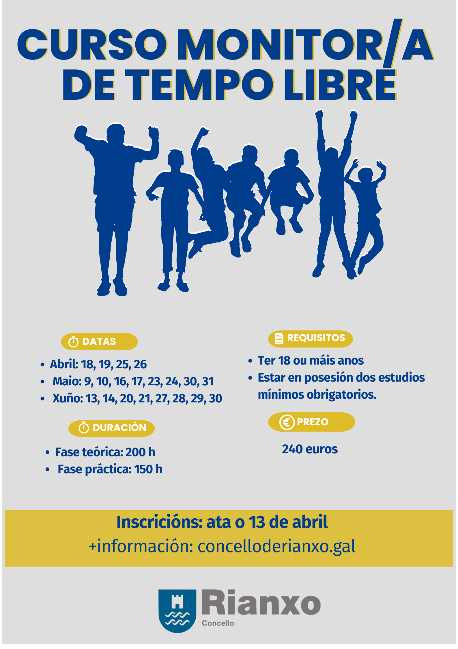Curso de monitor/a de tempo libre (normativa establecida no Decreto 50/2000, do 20 de xaneiro, polo que se refunde e actualiza a normativa vixente en materia de xuventude, e polo Decreto 58/2012, do 12 de xaneiro, polo que se modifica o Decreto 50/2000 e se adapta á Directiva 2006/123/CE, para a obtención do Título Oficial de Monitor de Tempo Libre en Galicia.) Duración Fase teórica-práctica: 200 horas Fase práctica: 150...