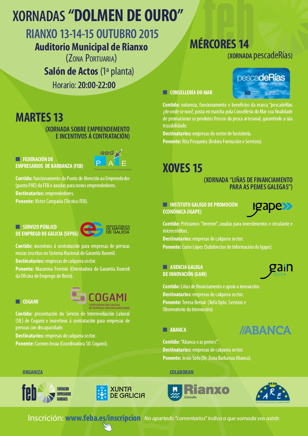 A Federación de Empresarios do Barbanza organiza, en colaboración co Concello de Rianxo e a Asociación de Empresarios de Rianxo, as xornadas do Dolmen de Ouro 2015 no Auditorio de Rianxo os días 13, 14 e 15 de outubro.