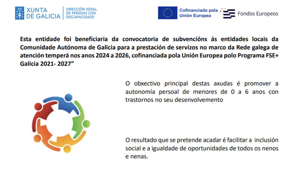 Dentro do Programa Operativo FSE Galicia 2014-2020 "O FSE inviste no teu futuro", o Concello de Rianxo foi beneficiaria da convocatoria de subvencións ás entidades locais da Comunidade Autónoma de Galicia para a prestacións do servizo no marco da Rede Galega de Atención Temperá nos anos 2024 a 2026, cofinanciada pola Unión Europea.