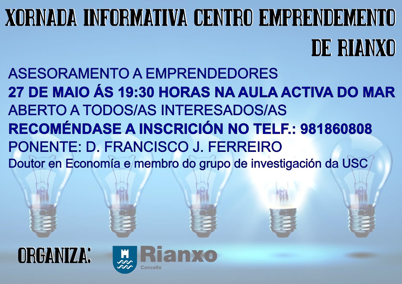 O Concello de Rianxo organiza unha xornada informativa sobre a posta en marcha do Centro de Emprendemento, dirixido a persoas emprendedoras, o 27 de maio ás 19:30h na Aula Activa do Mar.
