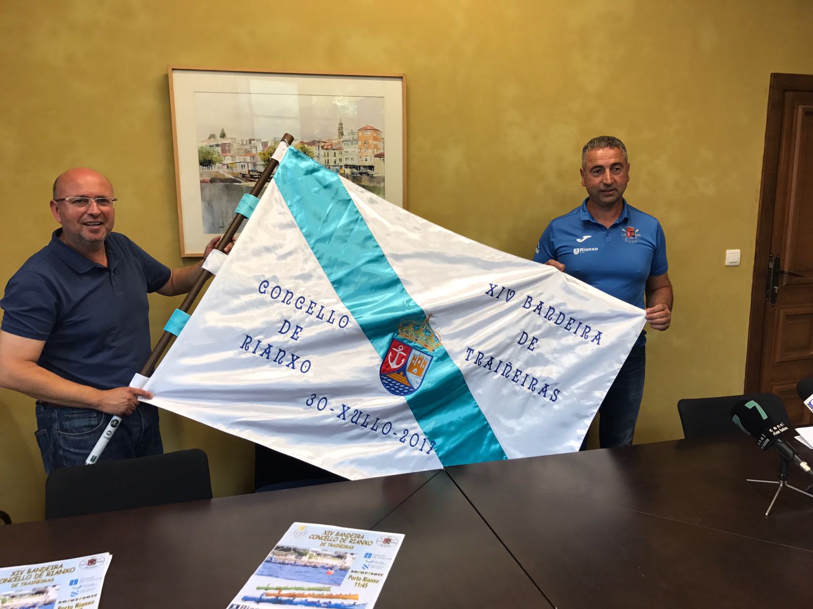 Onte presentouse no Salón de Plenos do Concello de Rianxo a XIV BANDEIRA DE TRAIÑEIRAS CONCELLO DE RIANXO, coa presenza de Adolfo Muíños, alcalde de Rianxo e Ramón Vicente Vicente, presidente do Club de Remo Rianxo.