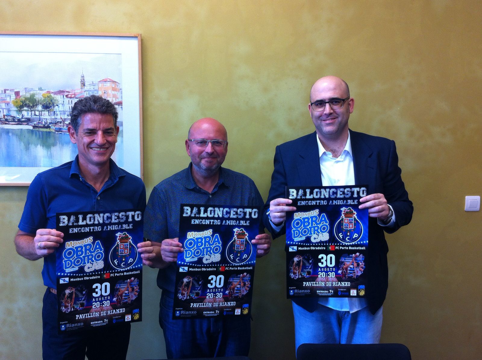A Casa do Concello de Rianxo foi o escenario da presentación do encontro amigable que disputarán o Monbús Obradoiro - FC Porto Basketball o vindeiro mércores, 30 de agosto, ás 20:30 h. O acto correou a cargo de Óscar Rodríguez, conselleiro do Obradoiro CAB, José Luis Mateo, director xeral do Obradoiro CAB e Adolfo Muíños, alcalde de Rianxo.