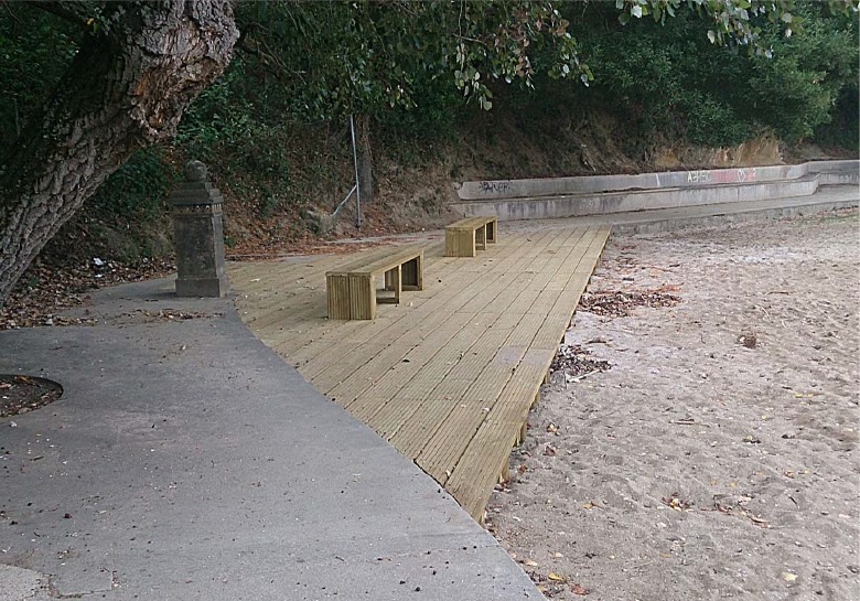• Instalación dunha rampla de madeira que cubre o desnivel dende o dique ata o areal de Quenxo. • Colocación dunha pasarela que comunica a nova rampla de acceso á praia co tramo de paseo marítimo existente. Esta pasarela tamén permite o acceso para a contemplación da escultura da Virxe de Guadalupe de Bert Gerresheim que o Concello de Rianxo instalou neste lugar.